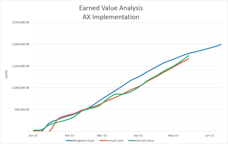 Using this veiw, this project looks to be performing amazingly well. Actual costs to date are well below budgeted costs for the project-to-date. Executive management reviewing this status would most likely be very pleased. However, that’s only 2/3 of the story.[pms-restrict subscription_plans=”1607″] Let’s add a line for earned value and see what the result looks like: